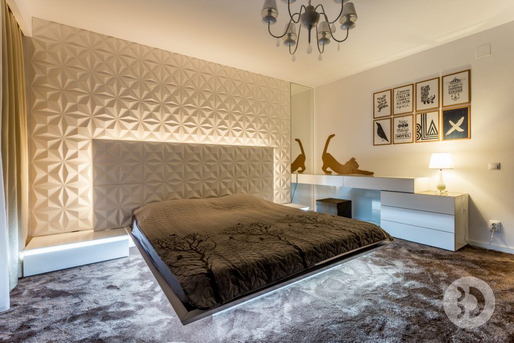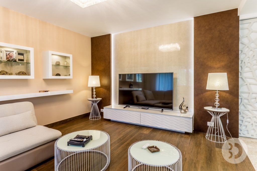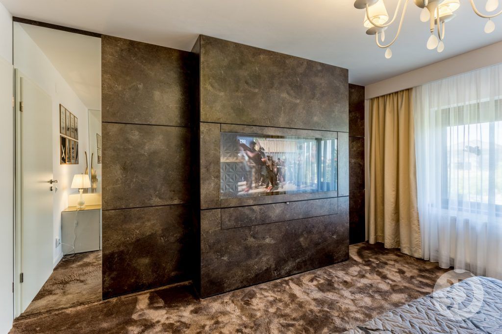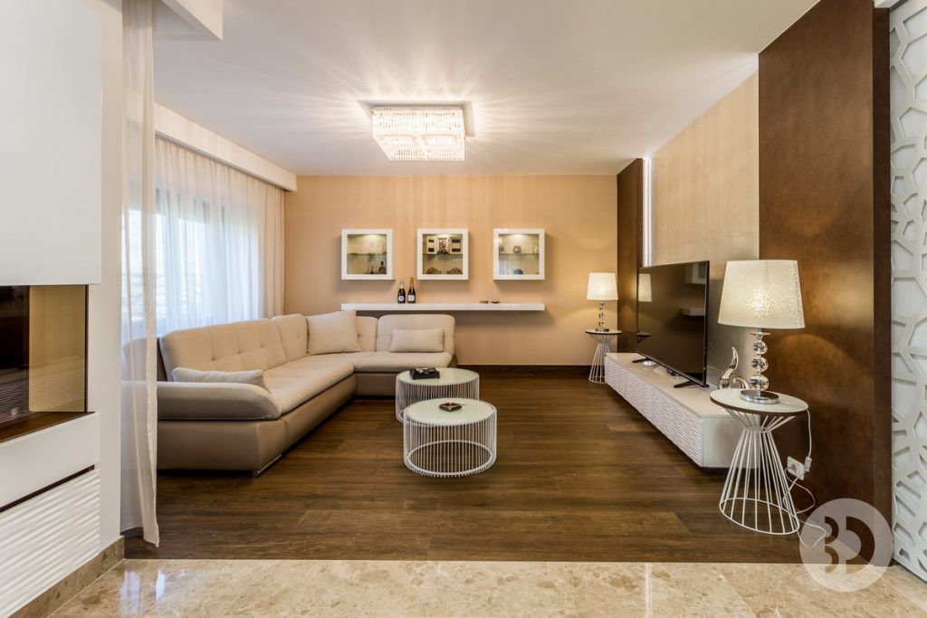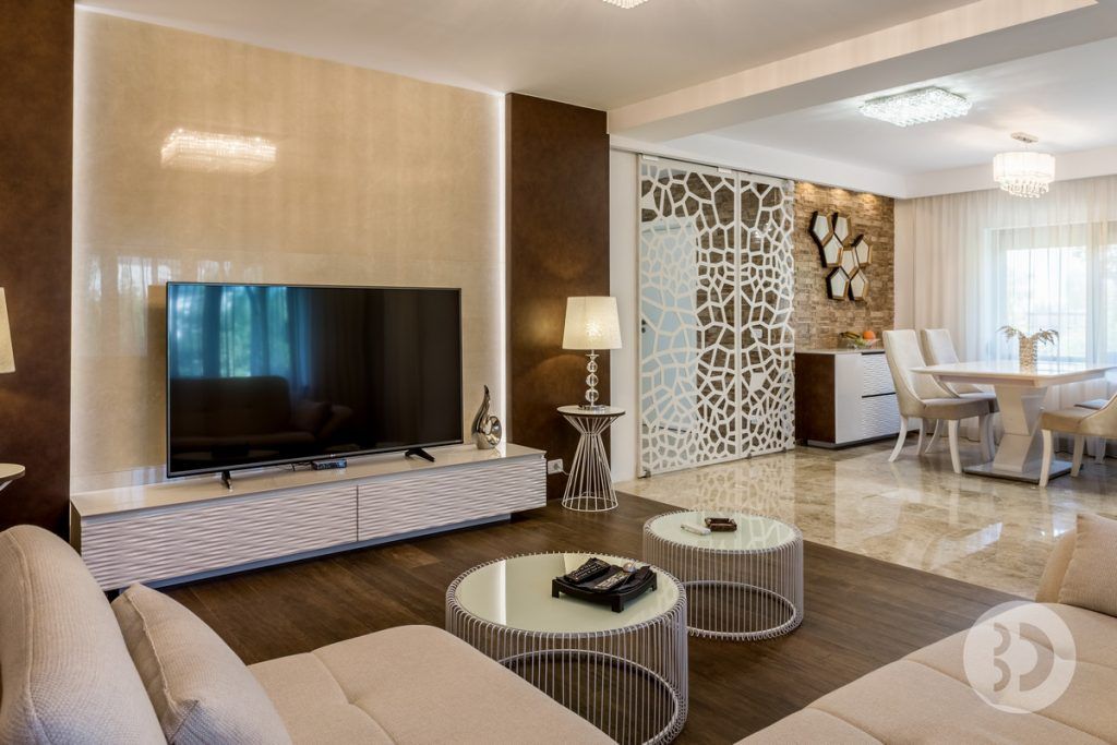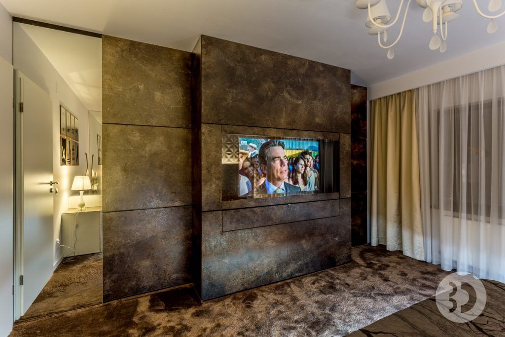 Nuanta de maro-brun a fost prelungita pe peretele cu televizorul, conturand astfel o simetrie in acest sector al camerei. Lumina indirecta laterala contribuie la crearea unui scenariu placut in contextul variat al iluminatului din acest spatiu.”