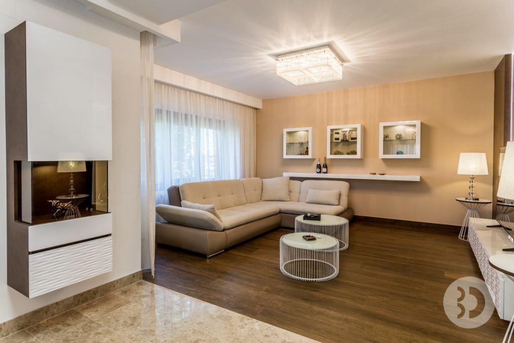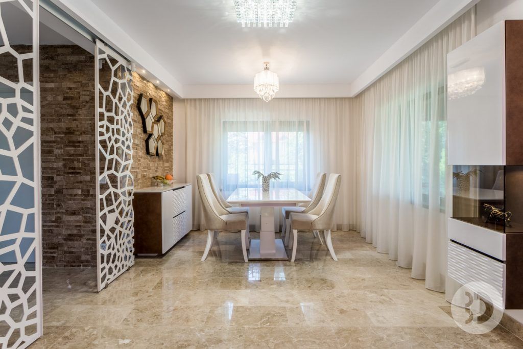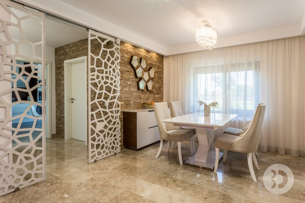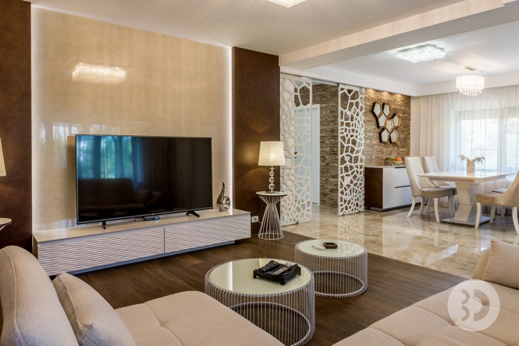 De asemenea, clientul si-a dorit ca zona de living sa fie intr-un fel delimitata de dining. Pentru ca avem totusi un open space, am mizat pe o separare vizuala realizata la nivelul pardoselii. Astfel, in zona de dining avem marmura, iar in partea de living, placi ceramice care imita fidel textura lemnului masiv. Jocul subtil al nuantelor si al texturilor face ca functiunile sa para separate dar unite in acelasi timp.