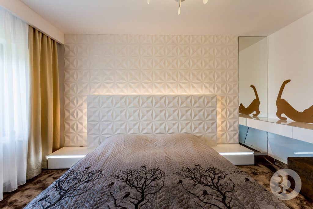 Si in dormitorul matrimonial, Dana a mizat pe un design unic. “Cu ajutorul furnizorilor de panouri decorative si al producatorului de mobilier am reusit sa pun in practica conceptul gandit pentru dormitor. A iesit ceea ce mi-am dorit, astfel ca mobilierul pare ca scos din tipare. Placarile din P AL si mobilierul care include televizorul, cuprinde la interior multe haine si lenjerii de pat pe o structura de rafturi, toate usile avand diverse sisteme de deschideri atipice, de jos in sus pentru usile mari. Restul fronturilor din dormitor sunt din M DF vopsit.