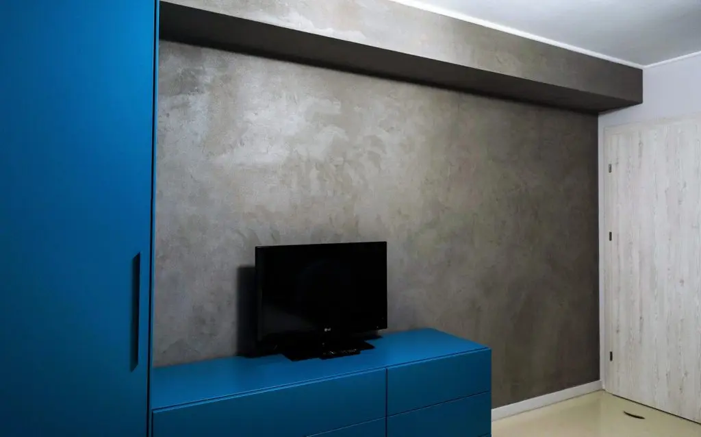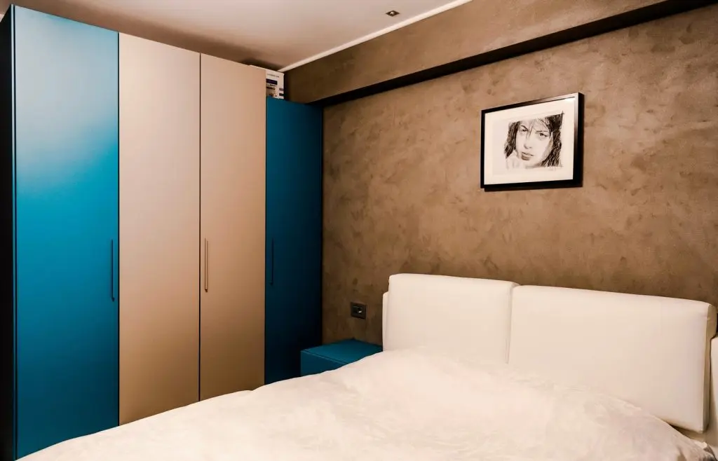 Trecerea spre dormitor se face printr-un hol mic unde a fost amenajat un corp de mobilier pentru depozitare. Si aici intalnim acelasi tip de pardoseala, iar peretii finisati cu o vopsea decorativa aplicata cu o tehnica speciala, alaturi de accentele de turcoaz reusesc sa contureze o amenajare dinamica, amplificand senzatia de spatiu.