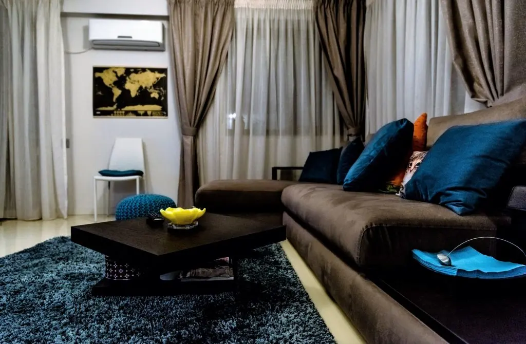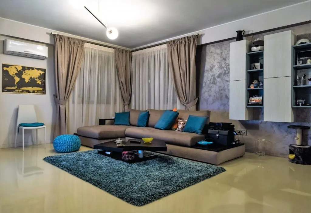 Decorul livingului urmeaza o linie minimalista, cu accent pe functionalitate. O canapea confortabila, tip coltar, o masuta de cafea si un corp de biblioteca cu spatii variate de depozitare compun o amenajare aerisita a camerei de zi.