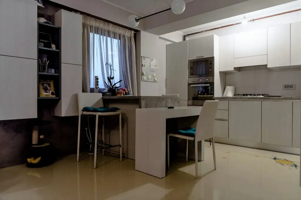 Electrocasnicele sunt incorporate in mobilier pentru un plus de unitate vizuala necesar in spatiile deschise (chiar si centrala termica a fost mascata cu o coloana pentru depozitare).