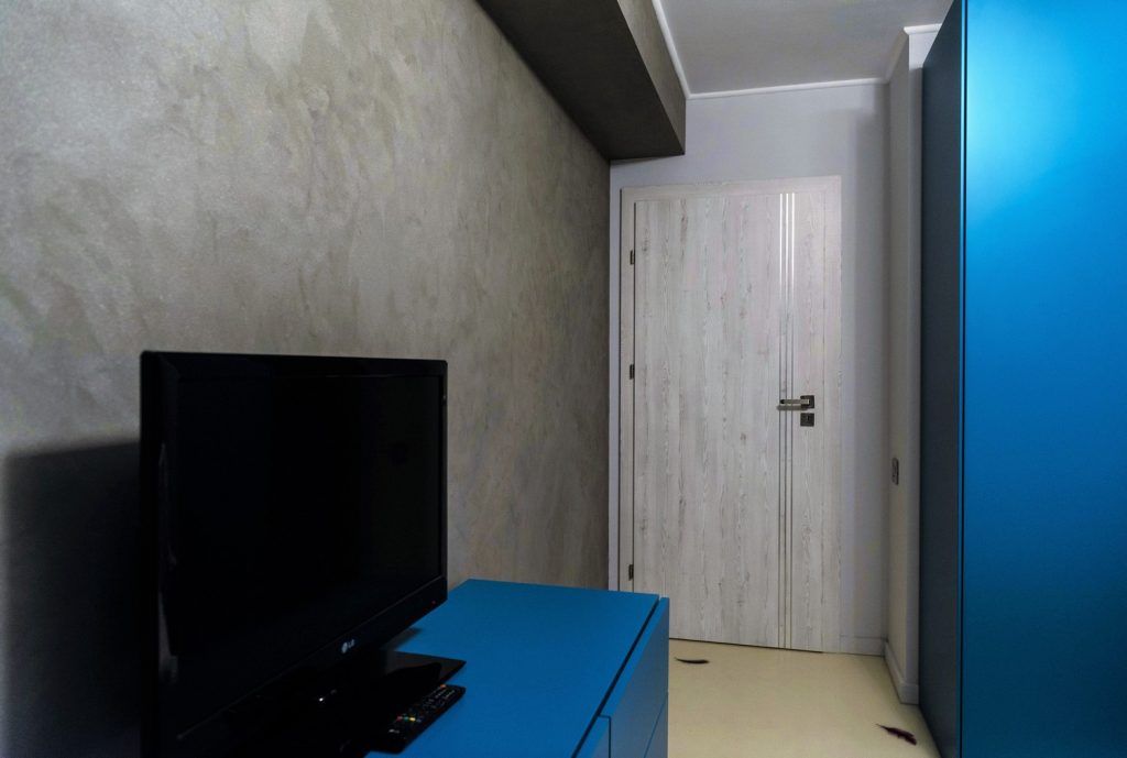 Trecerea spre dormitor se face printr-un hol mic unde a fost amenajat un corp de mobilier pentru depozitare. Si aici intalnim acelasi tip de pardoseala, iar peretii finisati cu o vopsea decorativa aplicata cu o tehnica speciala, alaturi de accentele de turcoaz reusesc sa contureze o amenajare dinamica, amplificand senzatia de spatiu.
