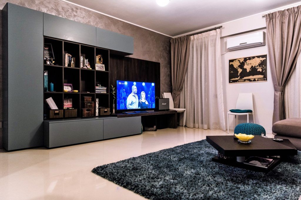 Decorul livingului urmeaza o linie minimalista, cu accent pe functionalitate. O canapea confortabila, tip coltar, o masuta de cafea si un corp de biblioteca cu spatii variate de depozitare compun o amenajare aerisita a camerei de zi.