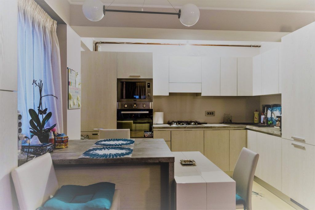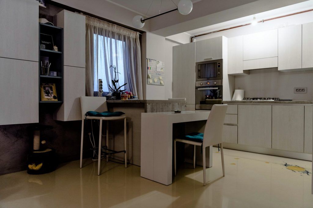 Electrocasnicele sunt incorporate in mobilier pentru un plus de unitate vizuala necesar in spatiile deschise (chiar si centrala termica a fost mascata cu o coloana pentru depozitare).