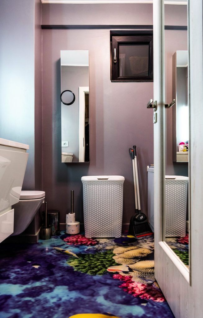 Motivul marin, discret sugerat la nivelul amenajarii este, poate, cel mai bine ilustrat in baie prin pardoseala turnata. Cu un albastru intens si tematica specifica, spatiul de 4 metri patrati al baii se anima intr-un mod neasteptat. Tonurile de alb lucios vin sa echilibreze decorul, potolind intensitatea albastrului.