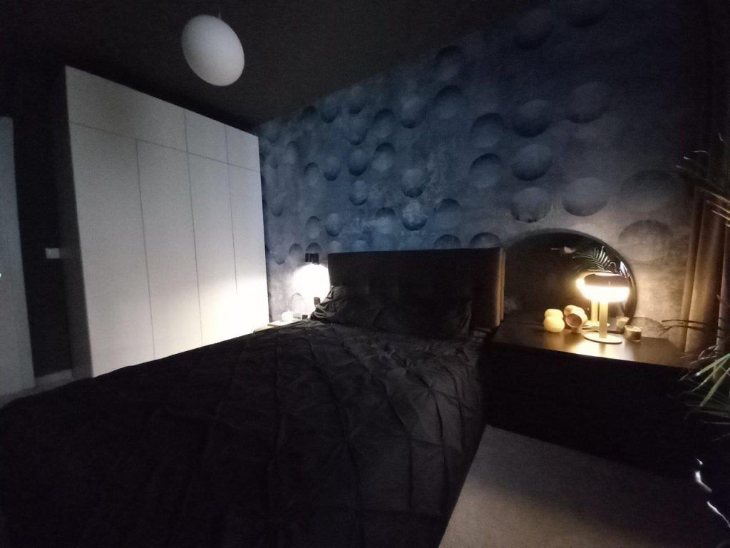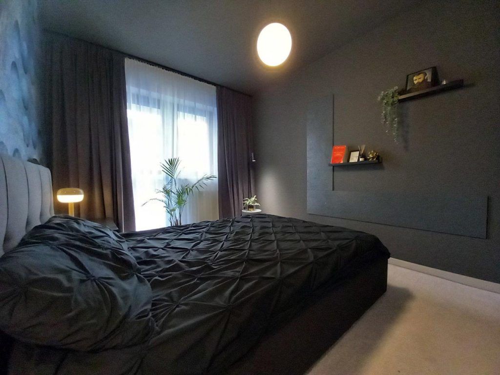 Accentul l-a pus pe amenajarea dormitorului care sa asigure relaxarea si confortul maxim pentru somn atfel ca peretii au fost finisati gri inchis iar impreuna cu draperiile inchise la culoare chiar si in timpul verii cand e soarele cel mai puternic ziua sa poata face intuneric deplin in dormitor.