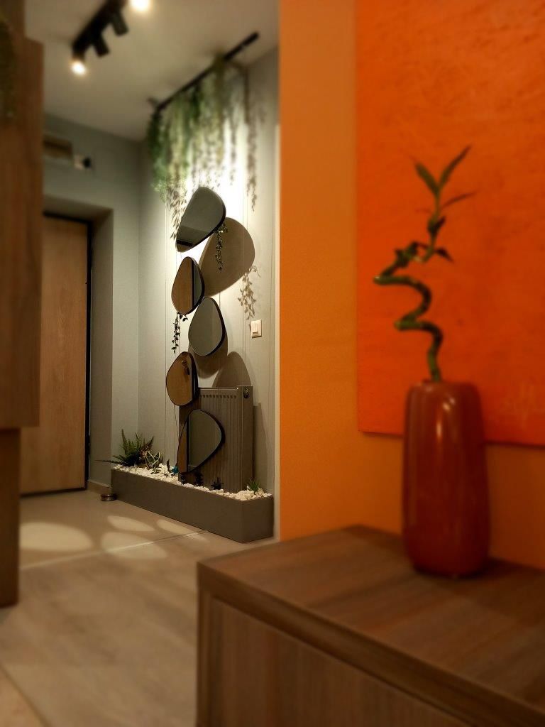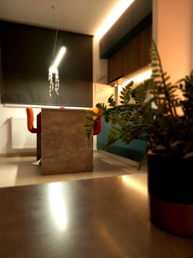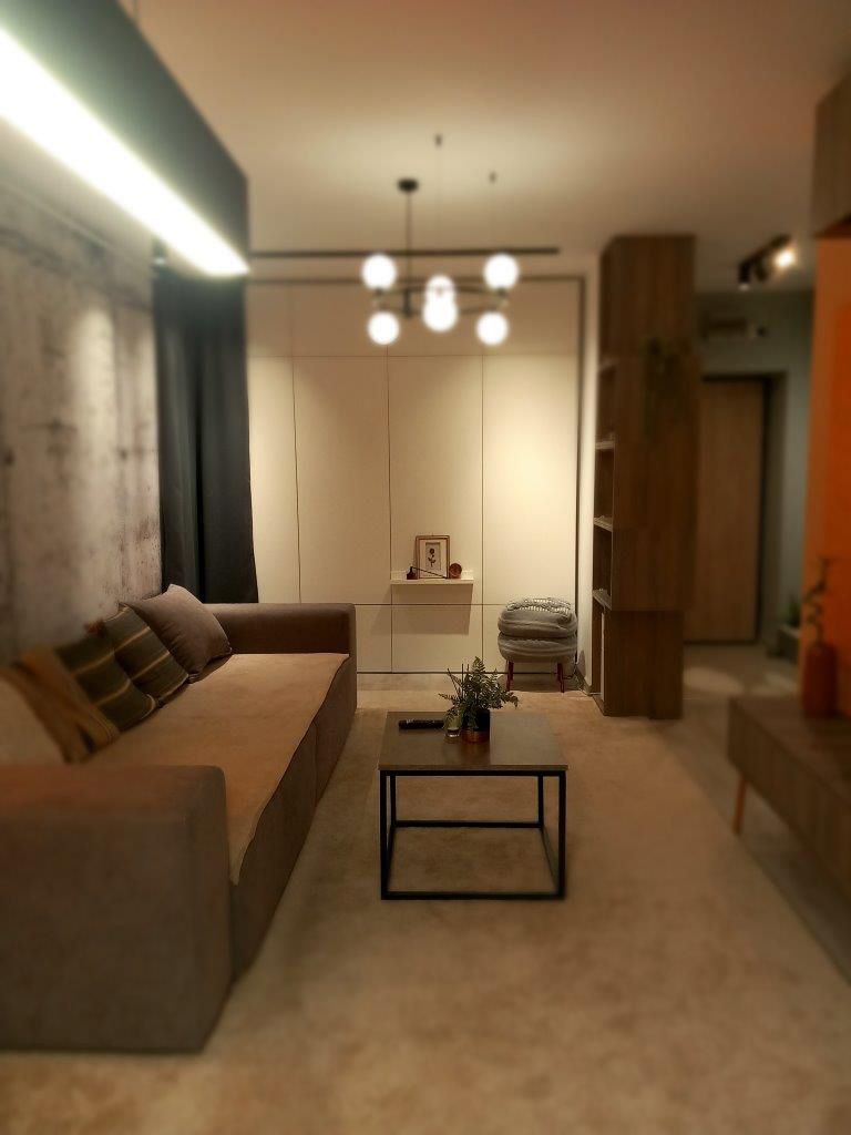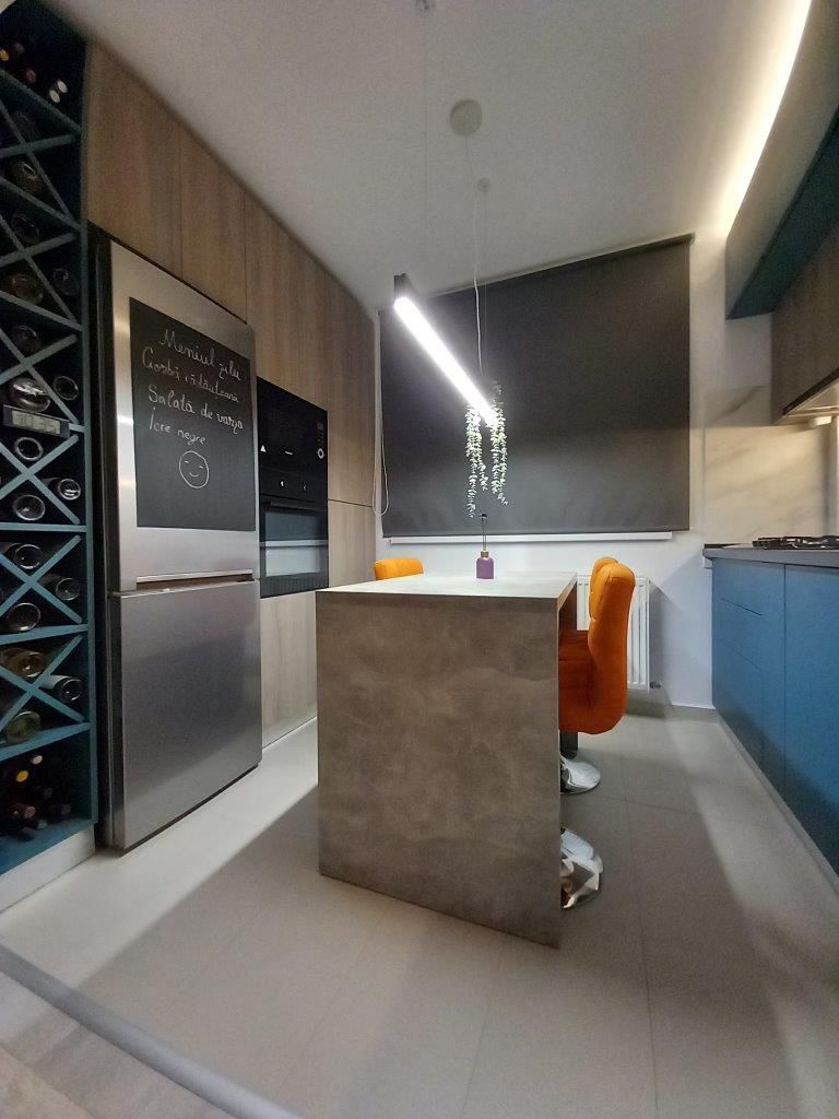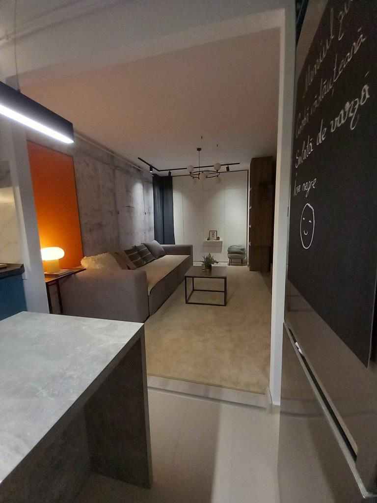 Pentru aceasta noua locuinta Catalin a conturat un concept modern, cu influente ale stilului industrial si tonuri de culoare inchisa. Regasim in intreaga amenajare mai multe zone mici de interes, detalii atat functionale cat si estetice: partitia tip bar din holul de intrare, decorul zen care inglobeaza caloriferul din hol; tabla de scris neagra de pe frigider.