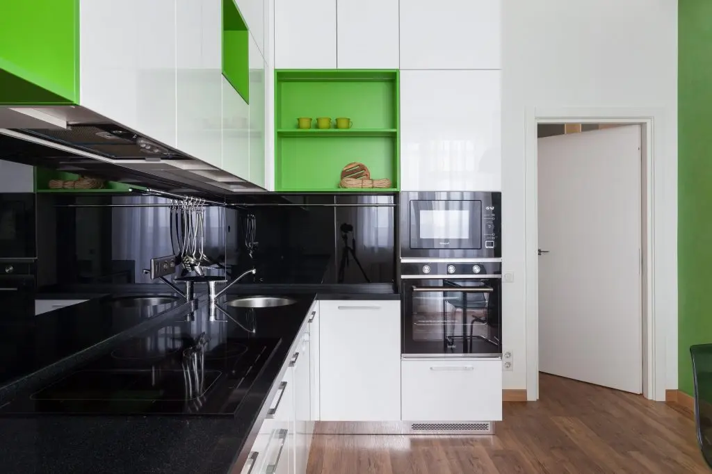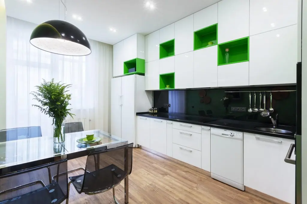 Pentru bucatarie, designerul a mizat pe o abordare mai curajoasa, cu un intreg perete zugravit cu verde, iar in mobilier, insertii de rafturi tip cuburi tot in verde. Restul decorului este alb pentru a echilibra cromatica, iar insertiile de negru de la nivelul blatului si braului dintre corpuri aduc un plus de eleganta spatiului.