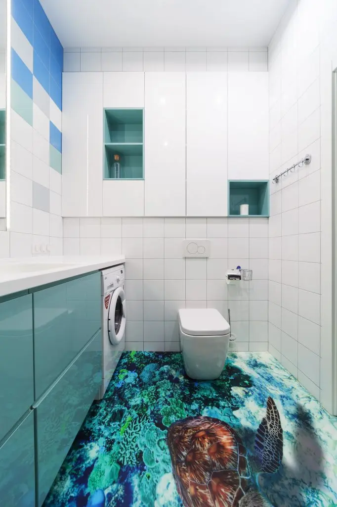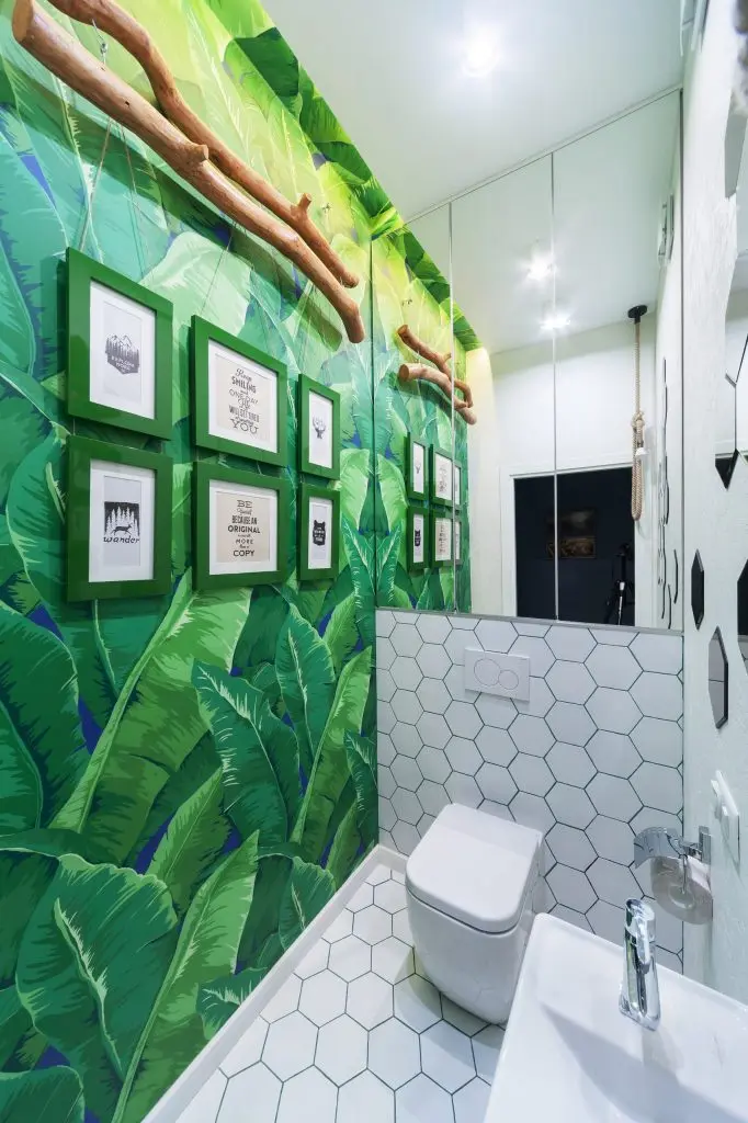 Dar poate cele mai spectaculoase spatii din acest apartament sunt baile. Pardoseala epoxidica alaturi de jocul cromatic al placilor de faianta transforma baia matrimoniala intr-una de senzatie. Nici baia de serviciu nu este mai prejos prin imprimeul cu motiv vegetal, tablourile cu rama verde sau crengile pe post de suport de prosoape.