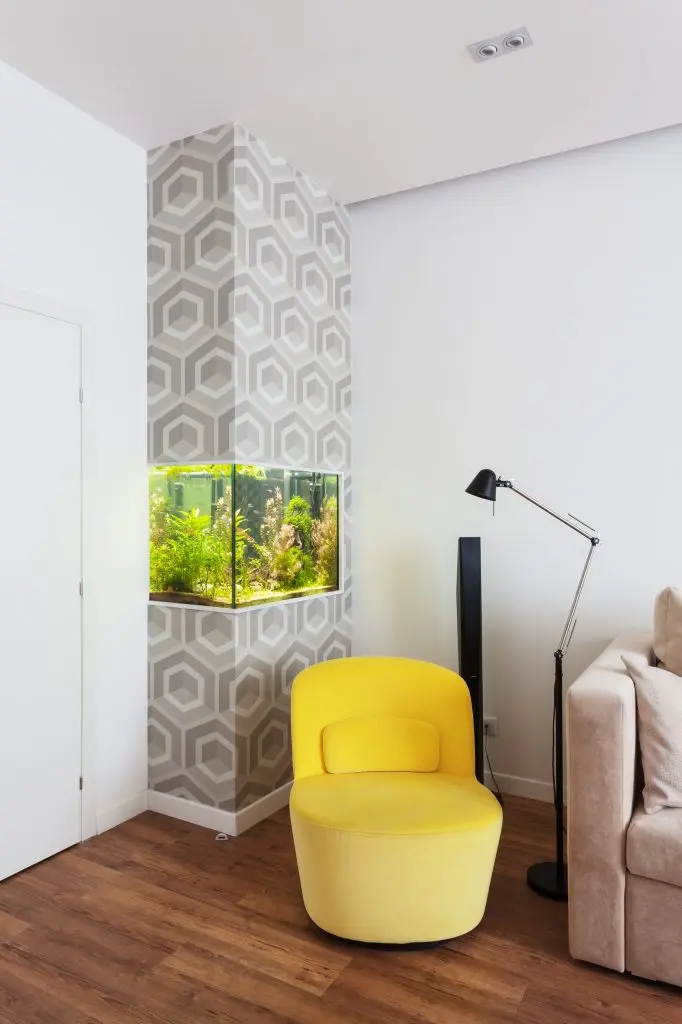 Acvariul este piesa principala a decorului, care intr-un mod creativ comunica cu holul, fiind vizibil atat din living cat si din hol.