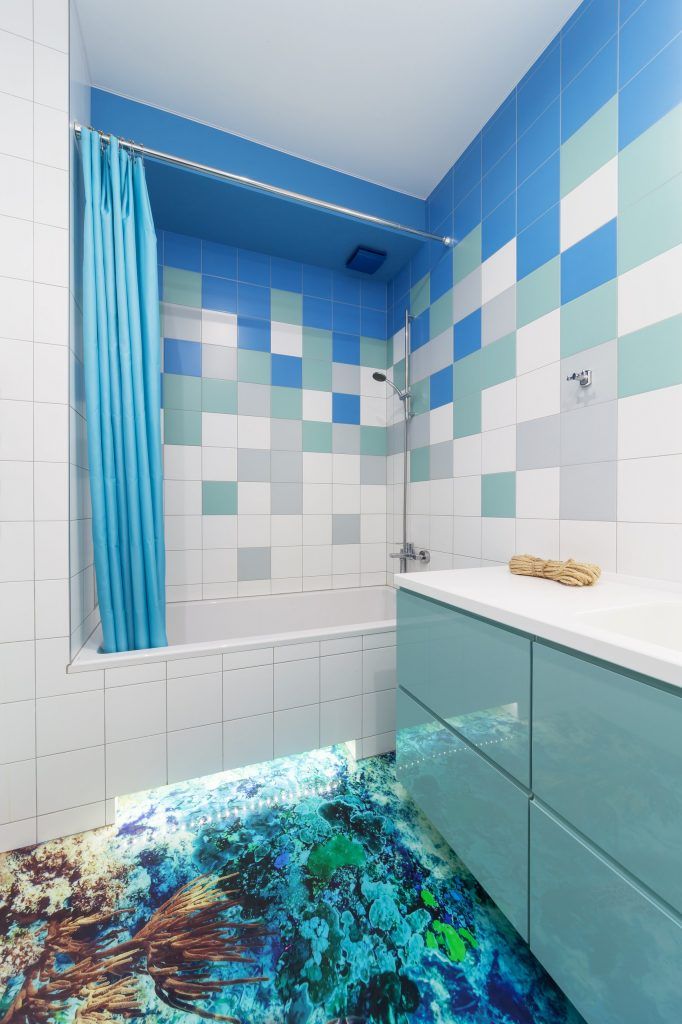 Fiecare functiune dezvolta din ideile si dorintele celor doi beneficiari, astfel ca spatiul ne poarta printr-un fel de poveste ce incepe in living cu un minunat acvariu, continua cu bucataria in care verdele este tematica principala pana in baile cu motiv vegetal si o surprinzatoare pardoseala epoxidica.
