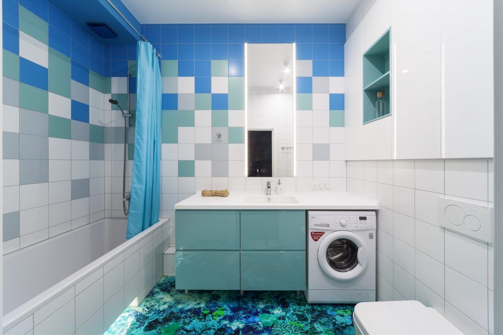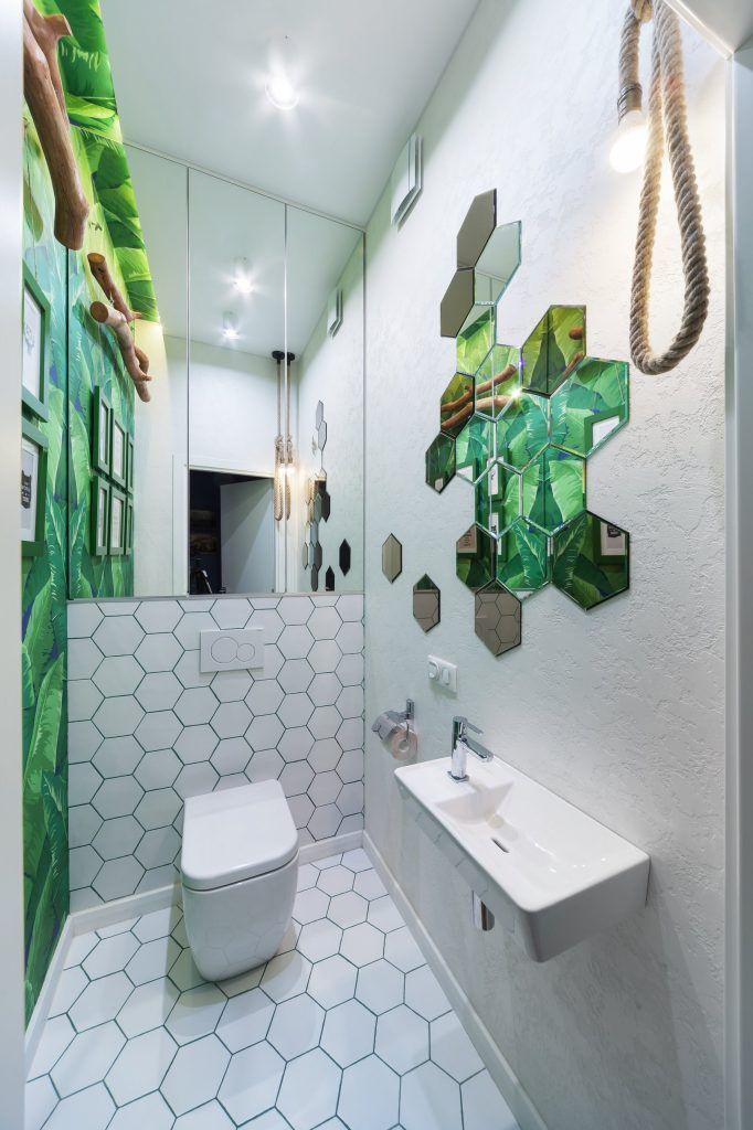 Dar poate cele mai spectaculoase spatii din acest apartament sunt baile. Pardoseala epoxidica alaturi de jocul cromatic al placilor de faianta transforma baia matrimoniala intr-una de senzatie. Nici baia de serviciu nu este mai prejos prin imprimeul cu motiv vegetal, tablourile cu rama verde sau crengile pe post de suport de prosoape.