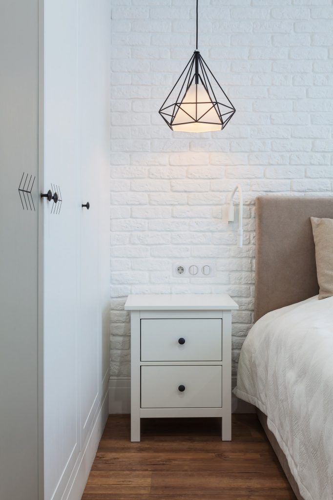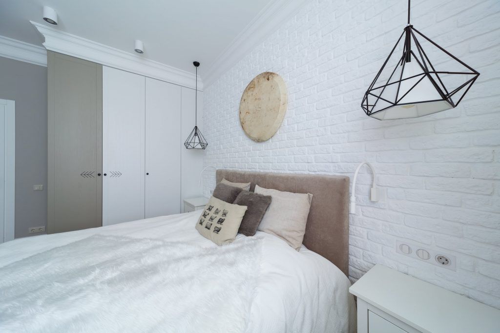 Dormitorul este cea mai cuminte incapere din aceasta locuinta. Predomina tonuri neutre de crem, bej si maro, si textura de caramida aparenta.