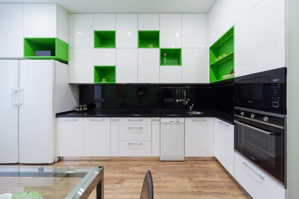 Pentru bucatarie, designerul a mizat pe o abordare mai curajoasa, cu un intreg perete zugravit cu verde, iar in mobilier, insertii de rafturi tip cuburi tot in verde. Restul decorului este alb pentru a echilibra cromatica, iar insertiile de negru de la nivelul blatului si braului dintre corpuri aduc un plus de eleganta spatiului.