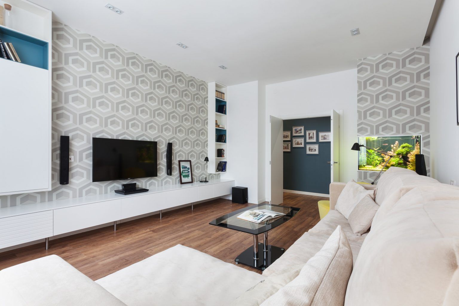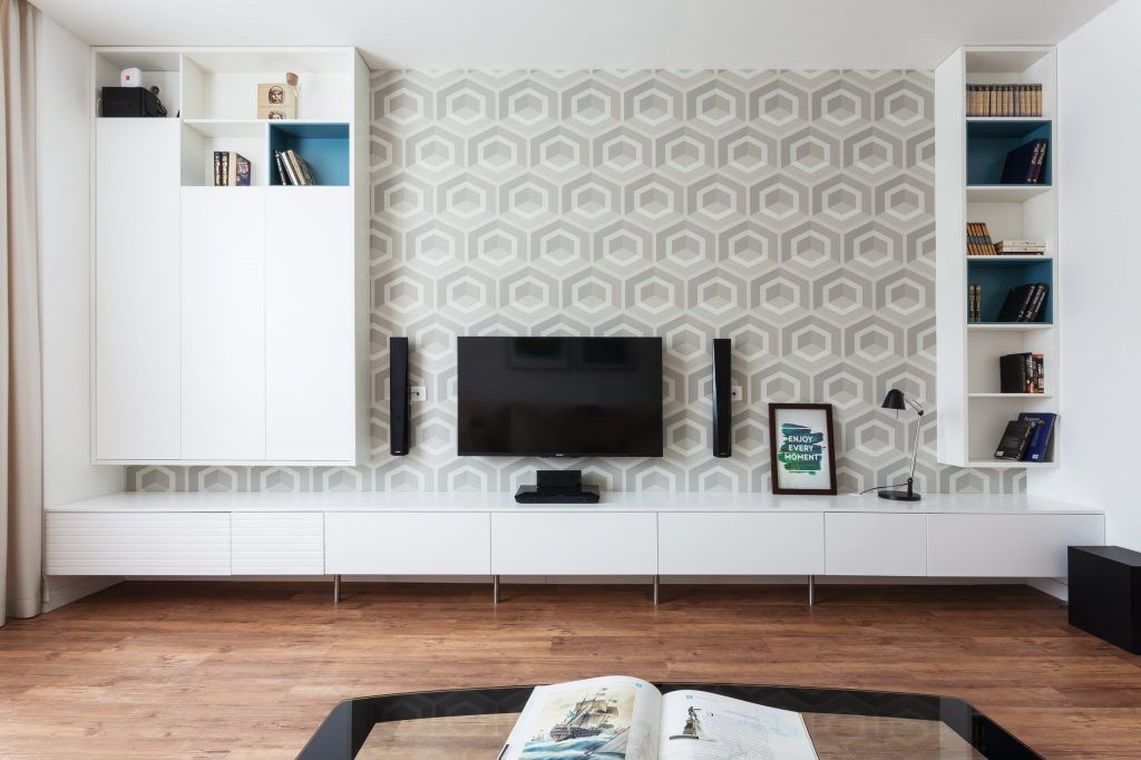 In ansamblul sau amenajarea este una coerenta, cu accente de culoare bine dozate care imprima dinamica spatiului. Livingul urmeaza un design minimal, cu o baza neutra pe care se dezvolta accentele de galben si verde. Pentru peretele cu televizorul s-a optat pentru o tapetare destul de neutra, cu un imprimeu discret.