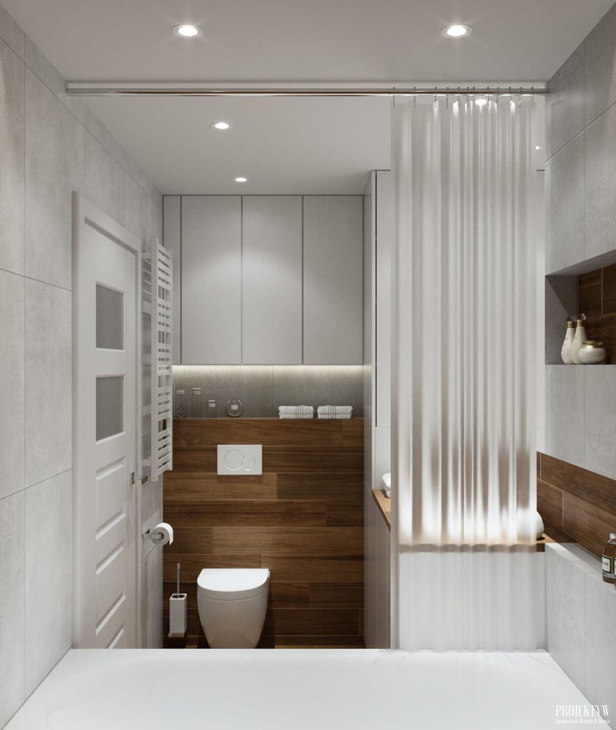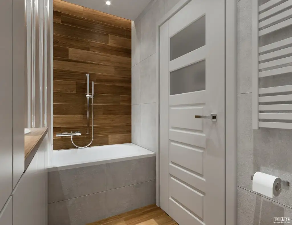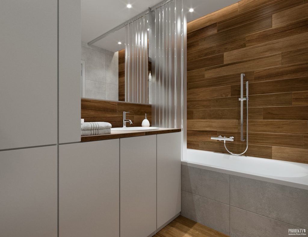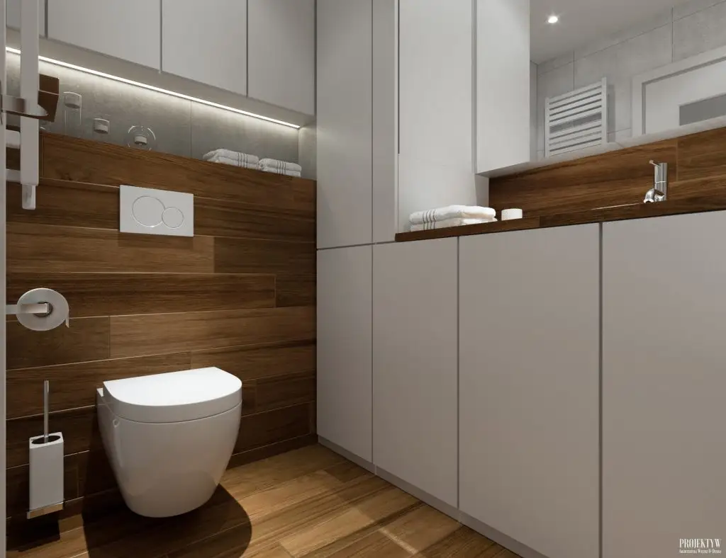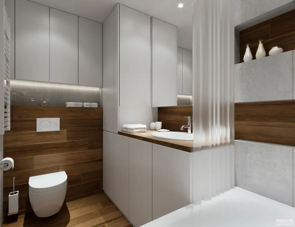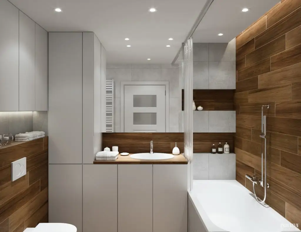 Si baia este excelent pusa in valoare. Predomina acelasi mix intre alb si placi ceramice care imita lemnul, iar spatiul este excelent optimizat, avand inserate multiple spatii de depozitare atat de utile.