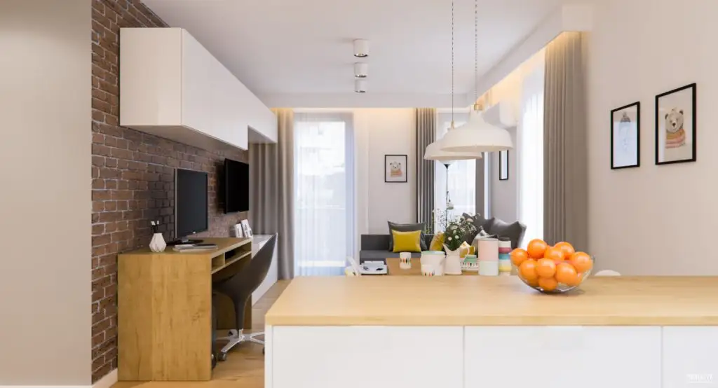 In partea de living iese in evidenta peretele-accent cu placaj ceramic ce imita caramida. Corpurile de mobilier sunt din MDF alb, scotand in evidenta si mai mult textura finisajului. Canapeaua coltar si masuta de cafea intregesc amenajarea zonei de conversatii si a spatiului zonei de zi. Ca subfunctiune a fost amenajat si un spatiu de birou, perfect integrat in spatiul livingului.