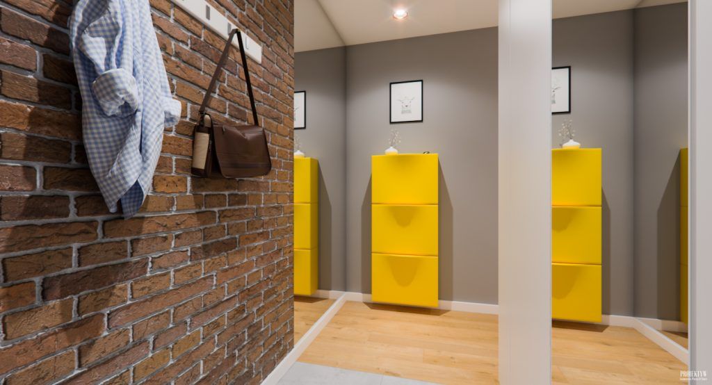 In spatiul holului au fost amenajate niste nise sugerand ideea de biblioteca si o continuitatea a spatiului de zi. Pantofarul galben pe peretele gri ofera o imagine ce iti stimuleaza privirea chiar de la intrarea in locuinta. Jocul oglinzilor, pozitionate in locuri cheie, ajuta la crearea unui efect de largire a spatiului. De privit cu atentie si luat ca model!