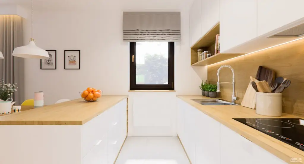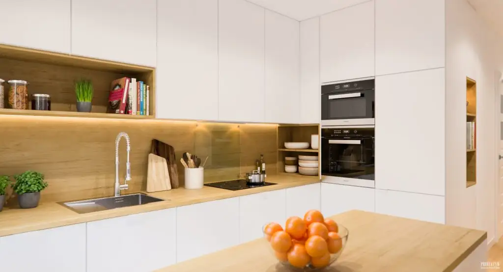 Mobilierul de bucatarie pastreaza o linie simpla a designului, cu alb si insertii din esenta de lemn de stejar. Uniformitatea este redata si prin incorporarea electrocasnicelor, de altfel recomandata atunci cand avem o bucatarie deschisa spre camera de zi. Interesant efectul creat prin placarea cu laminat de stejar, o zona de accent amenajata intre corpurile de bucatarie.