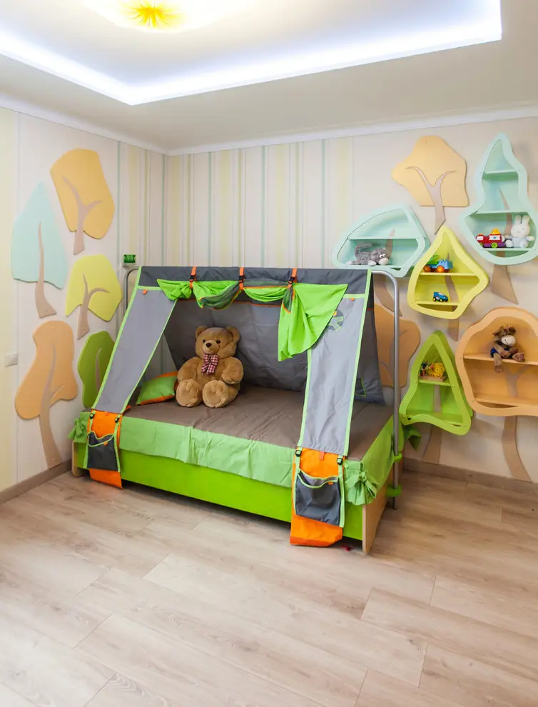 Camera copilului surprinde prin culorile vesele, imprimeul cu dungi de pe pereti sau prin forma inedita a scaunelor sau a rafturilor pentru jucarii.
