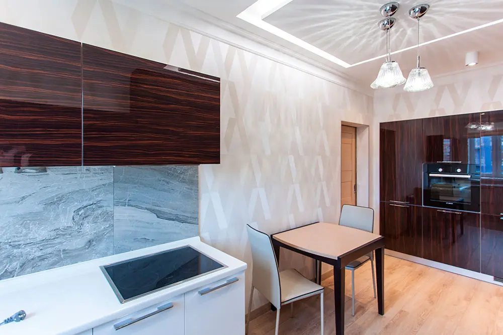 Spatiul bucatariei este destul de restrans, cu o dispunere pe trei laturi. Amenajarea ei urmeaza o linie simpla, axata pe functionalitate. Electrocasnicele mari sunt incastrate intr-o nisa, de cealalta parte a zonei de baza a bucatariei. Contrastul alb-crem versu maro-negru este reluat si in acest spatiu.