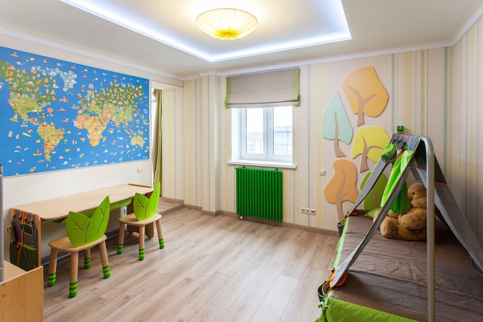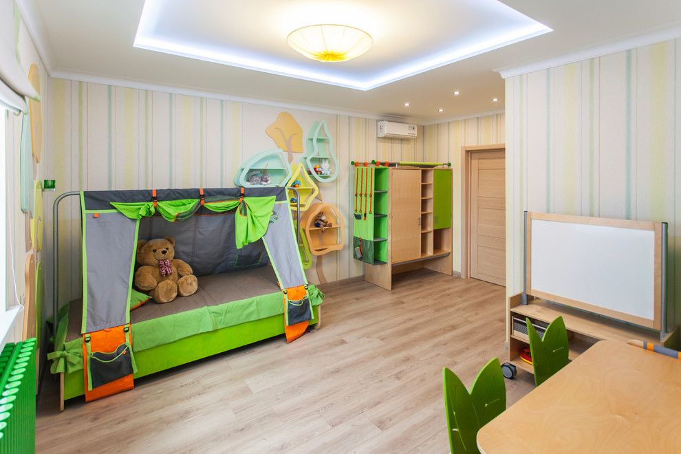 Camera copilului surprinde prin culorile vesele, imprimeul cu dungi de pe pereti sau prin forma inedita a scaunelor sau a rafturilor pentru jucarii.