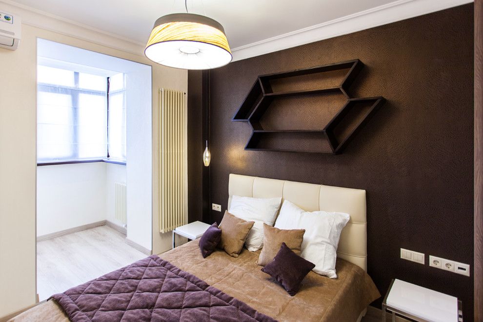 Un perete-accent maro vom intalni si in dormitor. Paleta este echilibrata de nuante deschise, placute pentru camera destinata odihnei. Si aici, spatiul balconului a fost inchis si integrat camerei oferind un loc pentru un birou, depozitare suplimentara sau poate o zona de toaleta.