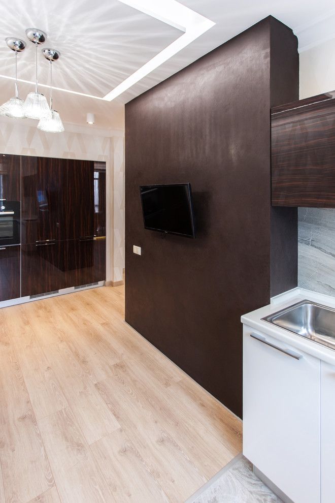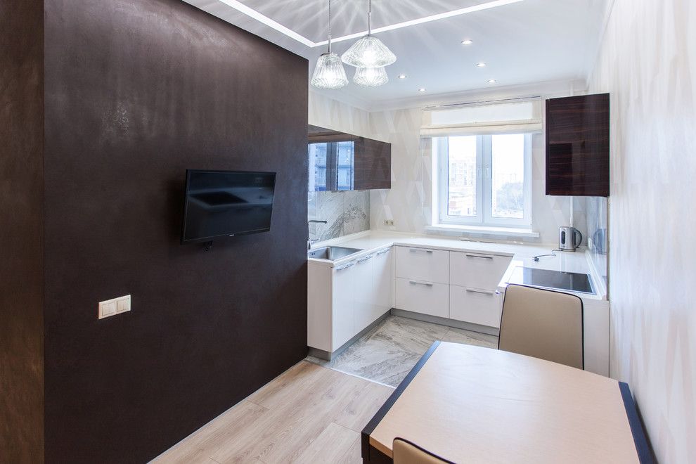 Spatiul bucatariei este destul de restrans, cu o dispunere pe trei laturi. Amenajarea ei urmeaza o linie simpla, axata pe functionalitate. Electrocasnicele mari sunt incastrate intr-o nisa, de cealalta parte a zonei de baza a bucatariei. Contrastul alb-crem versu maro-negru este reluat si in acest spatiu.