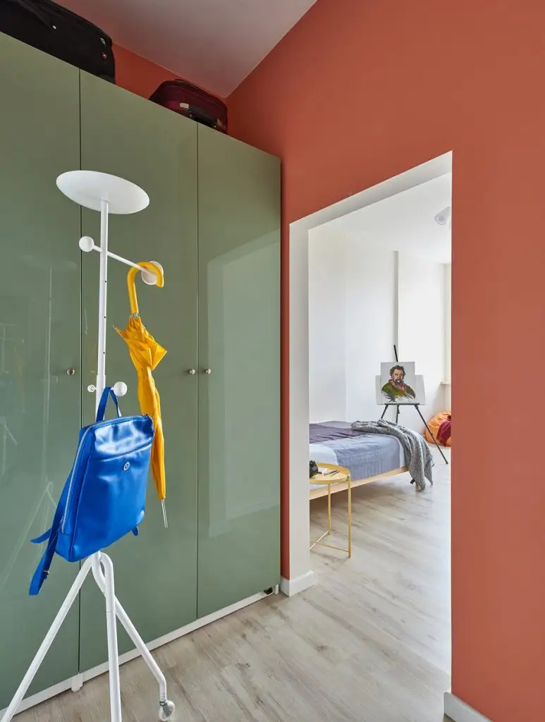 Inspiratie au gasit in interioarele scandinave, iar tusele de culoare au fost dorinta Marinei pentru a mai personaliza spatiul, evitand astfel monotonia. Astfel, doi pereti din hol au fost zugraviti cu portocaliu, iar dulapul de haine ales cu usi verzi, lucioase. Accesoriile din decor aduc si ele un strop de culoare (vezi masuta sau pouful pe post de fotoliu).