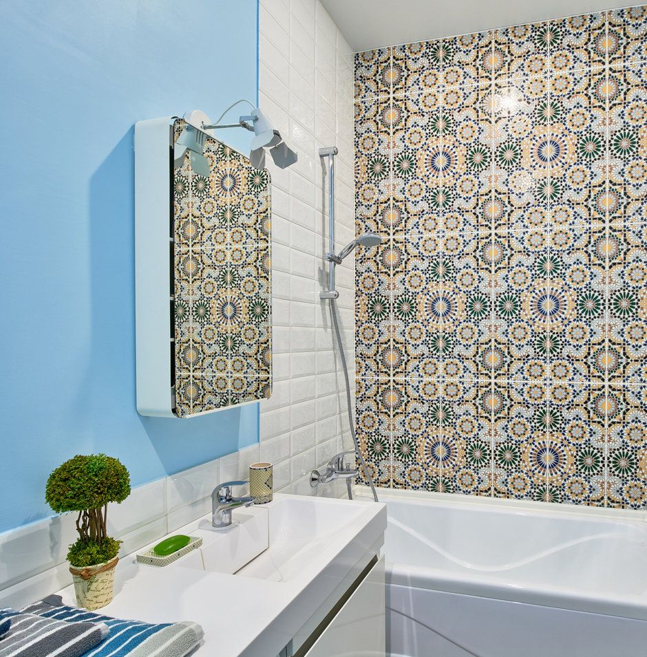 In baie, Marina a fost cea care a gandit decorul. S-a jucat cu culorile si imprimeurile, iar rezultatul este pe cat se poate de creativ. Peretii cu albastru ca cerul, placi albe tip Metro, gresie de culoarea nisipului si un perete-accent cu placi decorative intens colorate, iata un joc cromatic care aduce veselie spatiului.