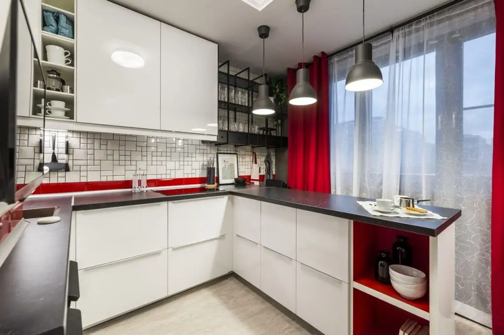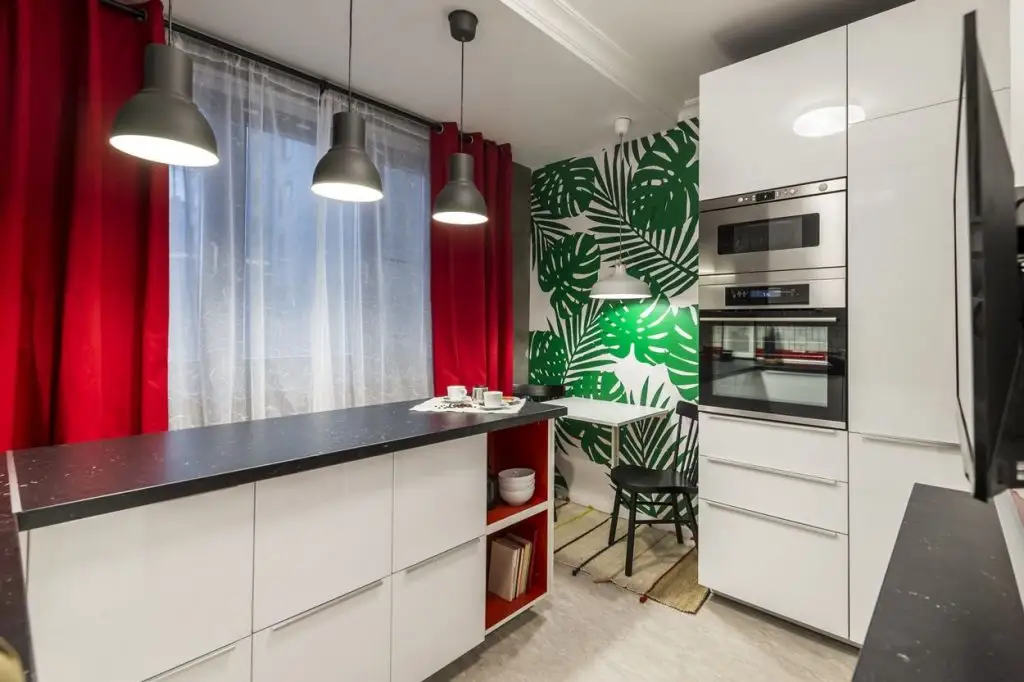 Accentele de negru te surprind inca de la prima imagine. Nu te astepti sa intalnesti negru intr-o bucatarie de 10 metri patrati ca suprafata. Si pentru ca totul sa para si mai intrigant, au fost adaugate si tuse de rosu, alaturi de un imprimeu vegetal sub forma unui tapet care pune in evidenta zona de luat masa. Este, fara doar si poate, o abordare curajoasa.