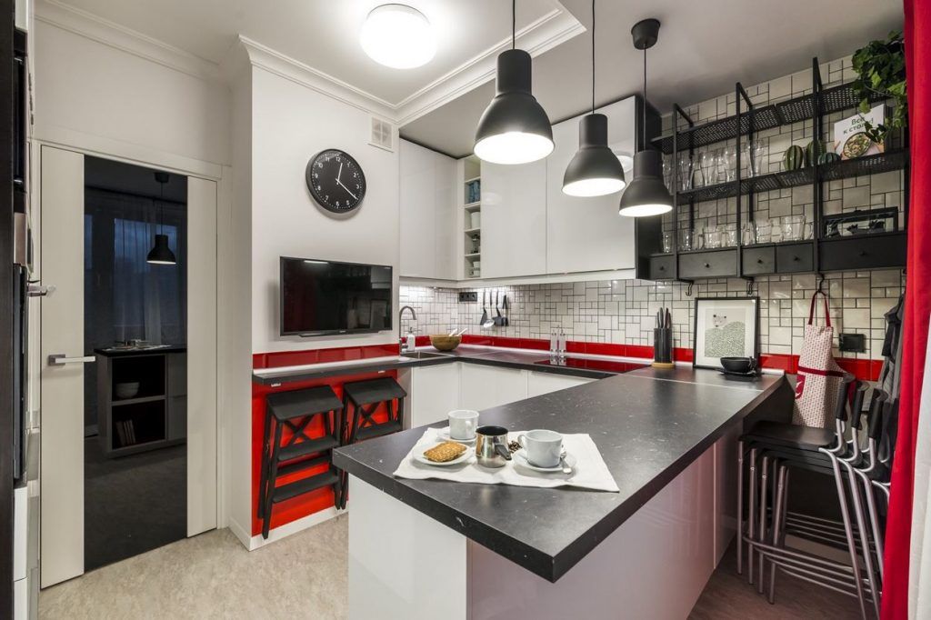 Aceasta bucatarie are si un caracter de zona de socializare. Zona de bar ce poate fi folosita si ca loc pentru luat masa, baut cafea, lucrat, este completata de o zona TV, amenajata ca o extensie a livingului; se remarca prin jumatate de perete zugravit cu rosu, un ceas negru si doua scaune tip bar.
