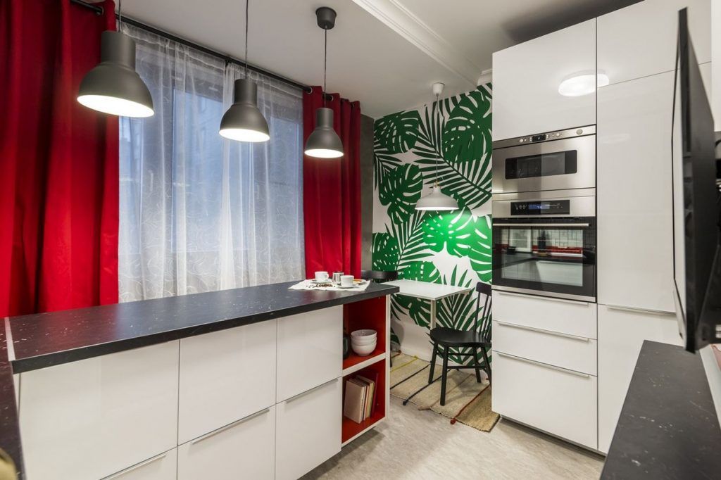 Accentele de negru te surprind inca de la prima imagine. Nu te astepti sa intalnesti negru intr-o bucatarie de 10 metri patrati ca suprafata. Si pentru ca totul sa para si mai intrigant, au fost adaugate si tuse de rosu, alaturi de un imprimeu vegetal sub forma unui tapet care pune in evidenta zona de luat masa. Este, fara doar si poate, o abordare curajoasa.