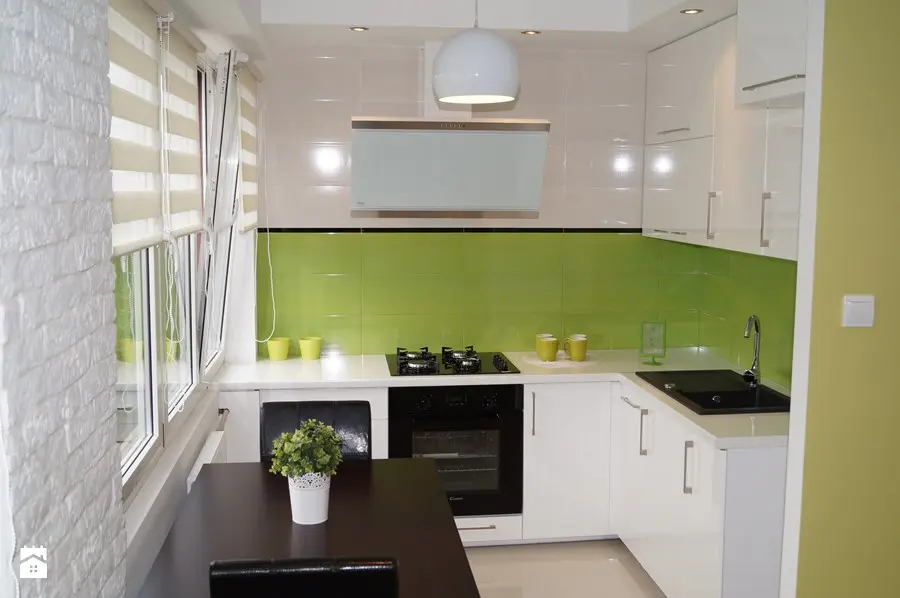 Chiar si intr-un astfel de spatiu mic poti sa conturezi o amenajare cu bun-gust si stil. In cazul nostru, prin alegerea acestei nuante de verde ca front de accent intre corpurile suspendate si cele principale, s-a reusit o scoatere din rutina, din monotonul alb-negru. Verdele, ca nuanta de accent atrage privirea si confera un aer fresh amenajarii. Completat cu mici accesorii de culoare asemanatoare, ghivece, cani sau boluri, decorul se dovedeste placut si coerent. Insertiile de negru ale chiuvetei, plitei si cuptorului dau un fel de profunzime si se integreaza minunat in contextul alb al mobilierului si peretilor.