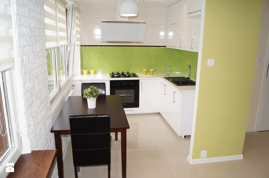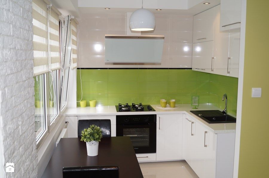 Chiar si intr-un astfel de spatiu mic poti sa conturezi o amenajare cu bun-gust si stil. In cazul nostru, prin alegerea acestei nuante de verde ca front de accent intre corpurile suspendate si cele principale, s-a reusit o scoatere din rutina, din monotonul alb-negru. Verdele, ca nuanta de accent atrage privirea si confera un aer fresh amenajarii. Completat cu mici accesorii de culoare asemanatoare, ghivece, cani sau boluri, decorul se dovedeste placut si coerent. Insertiile de negru ale chiuvetei, plitei si cuptorului dau un fel de profunzime si se integreaza minunat in contextul alb al mobilierului si peretilor.