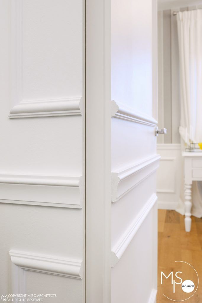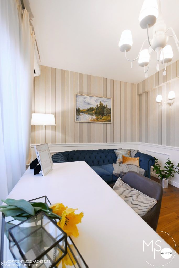 In cadrul acestei amenajari s-a folosit o gama larga de profile decorative, fiind elemente de baza al proiectului. Un alt detaliu deosebit il reprezinta usile ascunse cu sistemele de feronerie mascate astfel incat sa se alinieze cu linia peretilor si sa para ca ar face parte integranta din acestia. La nivelul pardoselii din hol si bucatarie, s-a ales o dispunere de placi alternate cu patratele intr-un joc alb-negru. Acest finisaj se potriveste perfect cu imaginea interbelica a imobilului, iar pardoseala din lemn de stejar cu o culoare calda si primitoare completeaza cromatic tabloul de ansamblu.