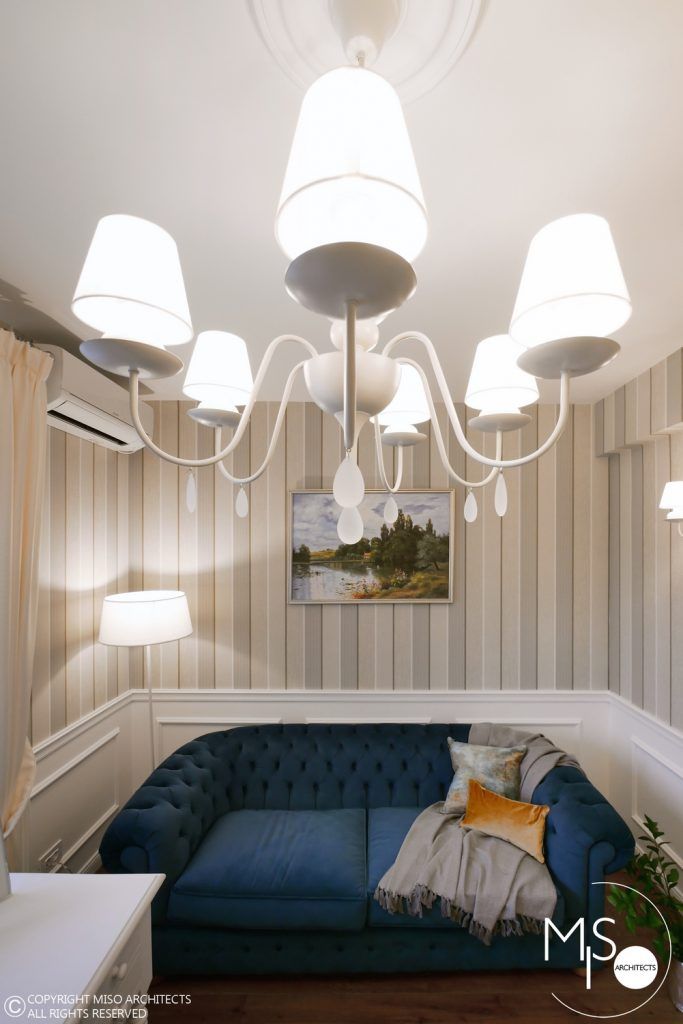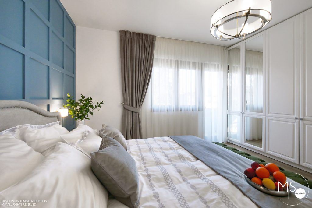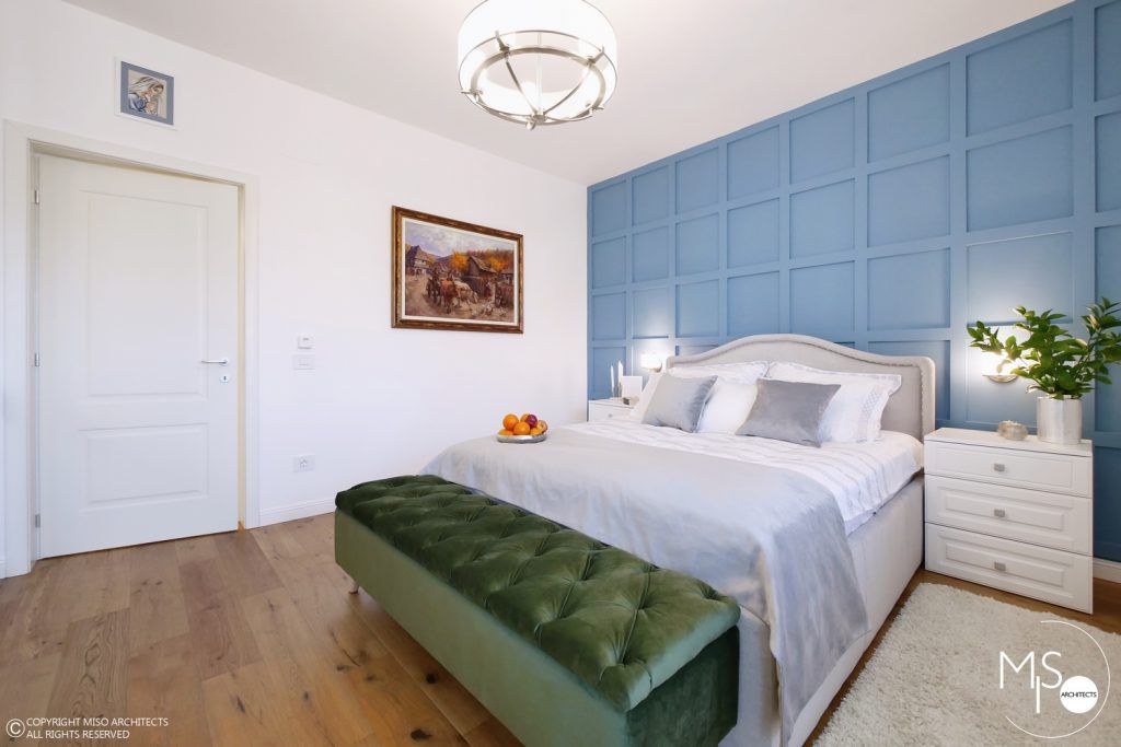 Dormitorul matrimonial are ca element cromatic principal albastrul pe care il regasim la nivelul peretelui-accent. Pe acest fundal a fost introdus patul tapitat, iar in fata lui adus un divan tip Chesterfield de culoare verde, aceeasi ca a fotoliului din living. Noptierele albe cu butoni decorativi apartin aceleasi povesti precum si dressingul cu usi albe si oglinzi dispus pe intreg peretele din fata patului. Candelabrul si aplicele intregesc absolut minunat imaginea de ansamblu.