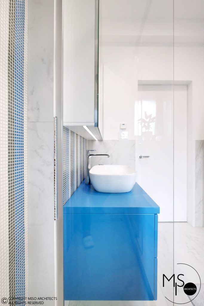 Baia a fost regandita in intregime fata de aspectul initial, finisajele ceramice si obiectele sanitare fiind atent puse in scena. Si aici vom regasi albastrul ca motiv cromatic principal, atat la nivelul mozaicului cat si al mobilei.