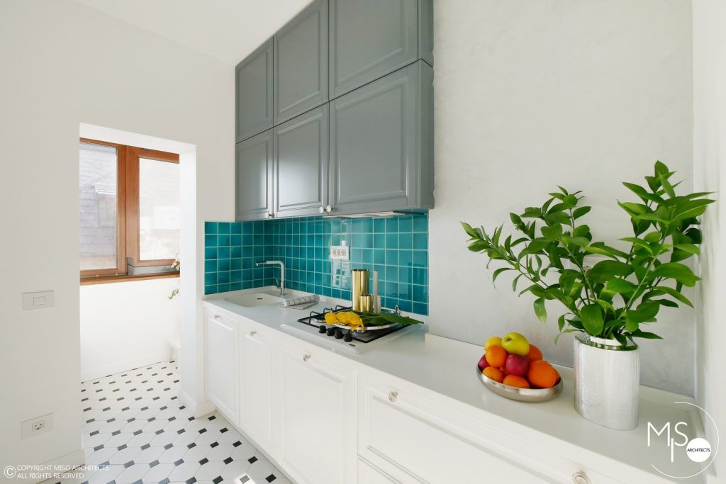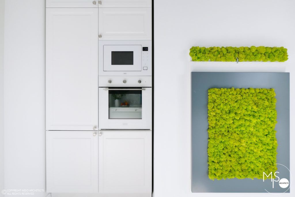 Bucataria a fost gandita sa functioneze optim in ciuda spatiului mic, de doar 6 metri patrati. S-a optat pentru o distribuire pe doua laturi, de o parte cu frigider si cuptoare incorporate, iar zona principala cu plita, chiuveta si cele doua masini de spalat, rufe si vase. Zona dintre blaturi a fost placata cu mozaic turcoaz, iar personajul principal al incaperii este de departe masuta pliabila pe perete, care se transforma intr-un tablou viu cu licheni decorativi.