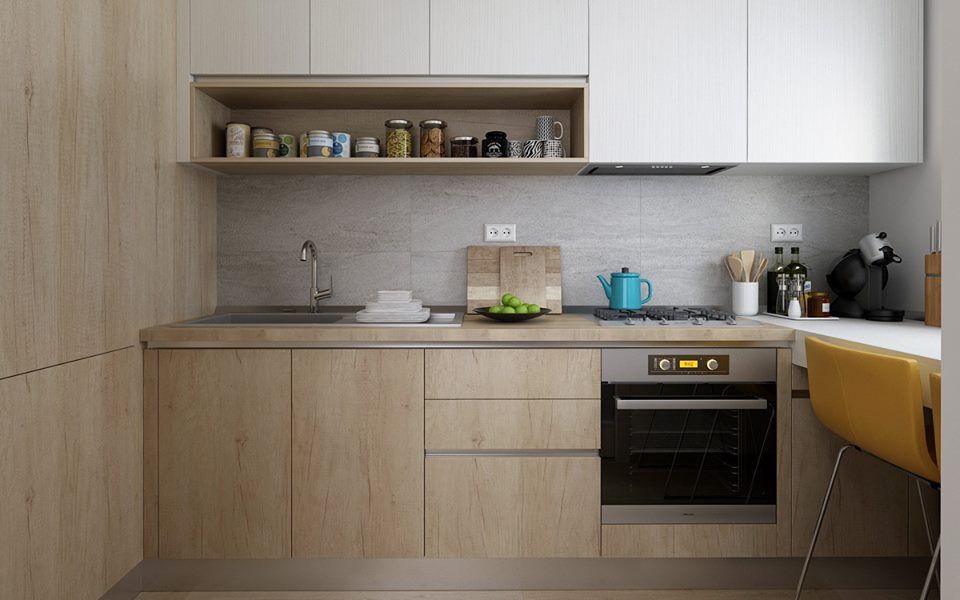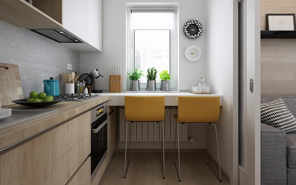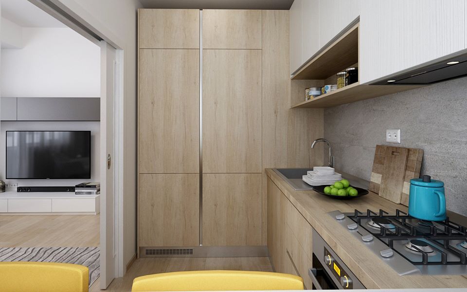 Acelasi tip de finisaj din lemn natur il intalnim si la amenajarea din bucatarie. In 6 metri patrati, avem tot ce este nevoie pentru o bucatarie functionala: depozitare eficienta prin corpuri de mobilier din pal si MDF, electrocasnice incastrate in mobilier, precum si un loc de luat masa amenajat la fereastra.