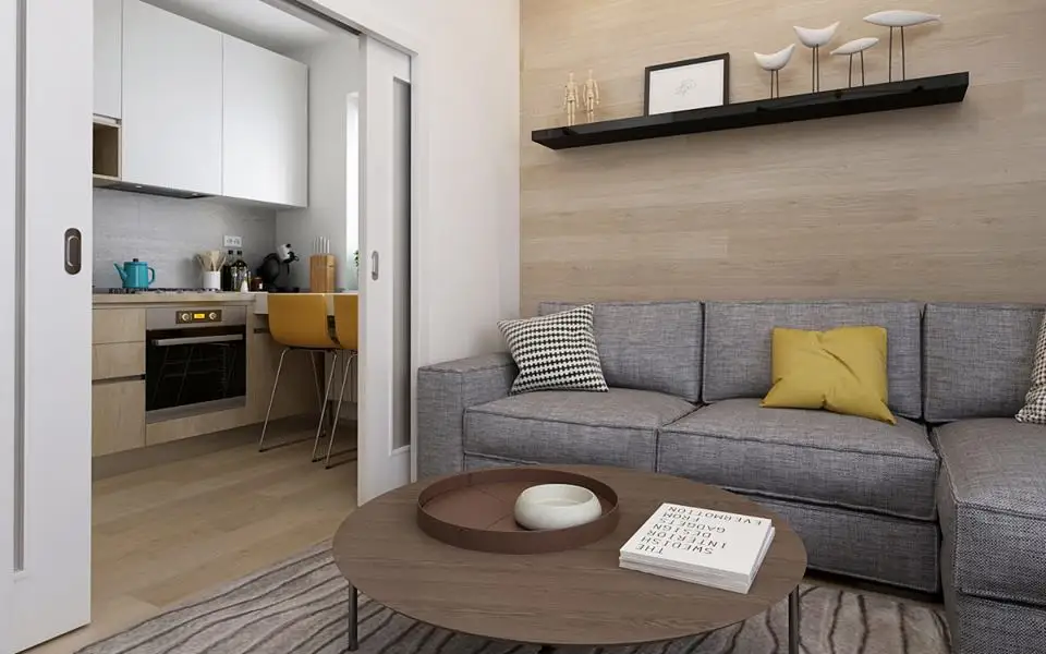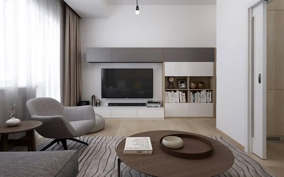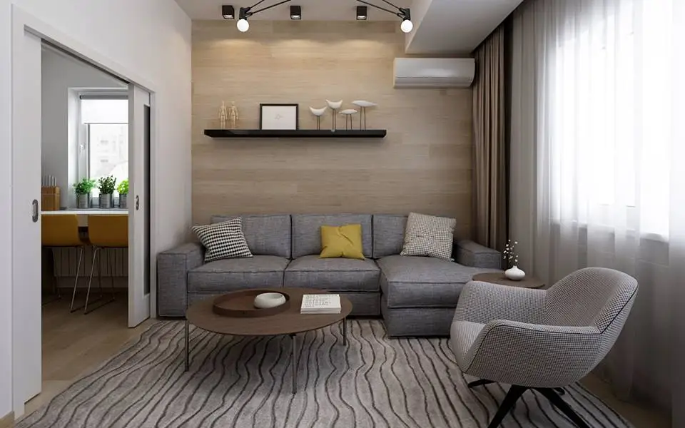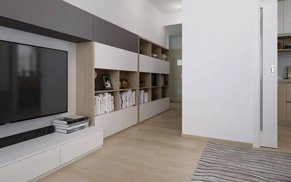 Vorbim despre un living de 16 metri patrati si obucatarie de 6,5 metri patraticare s-au transformat in incaperi de sine statatoare prin integrarea a 2 pereti falsi si a 2 usi culisante ce separa camerele. Prin aceste modificari, s-a creat astfel si un hol, ce nu exista inainte, intrarea in apartament fiind direct in living.