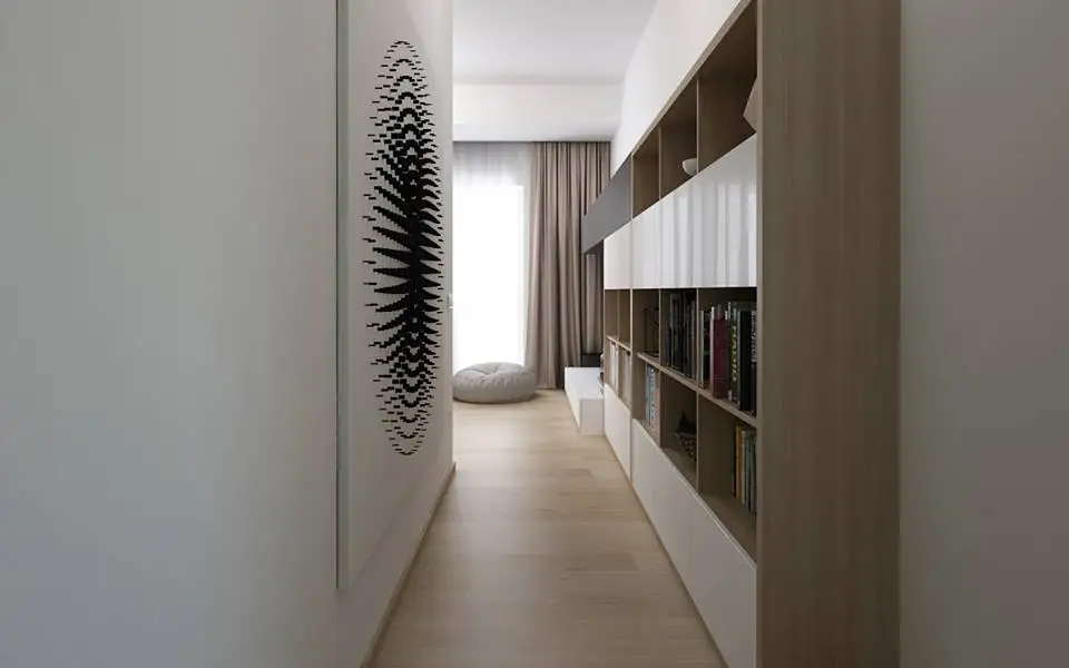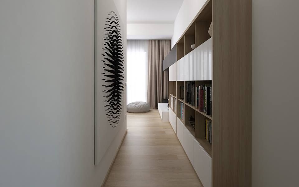 Piesele de mobilier cu finisaj din MDF vopsit asigura nevoia de depozitare fara insa a aglomera vizual incaperea. Pentru a obtine acest efect, corpurile sunt de o inaltime medie, iar albul lucios reflecta lumina si creeaza un efect de marire a spatiului. Corpul de biblioteca se prelungeste inspre usa de la intrare asigurand continuitatea de care aminteam mai sus.