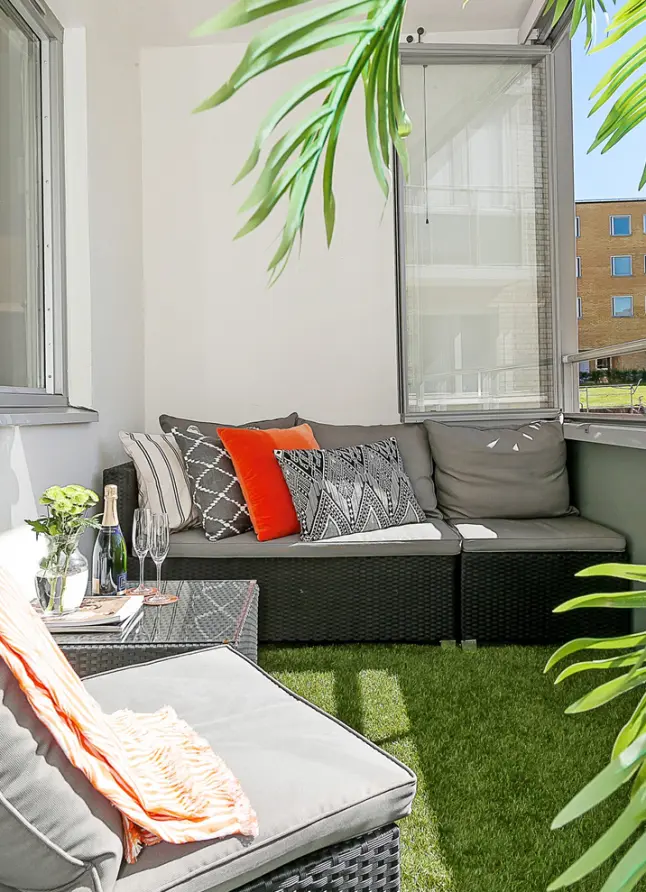Pardoseala de culoare tip mahon si masuta de cafea cu un aspect usor nefinisat se combina foarte bine cromatic cu detaliile din piele: perne decorative si covorul.