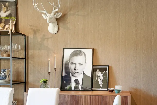 Un set de tacamuri gigant, o furculita si un cutit, ambele metalice, negre sunt asezate pe perete alb, capul de cerb cu ochelari negri si tablourile ilustrand posturi masculine sunt doar cateva din detaliile acestui spatiu plin de personalitate.