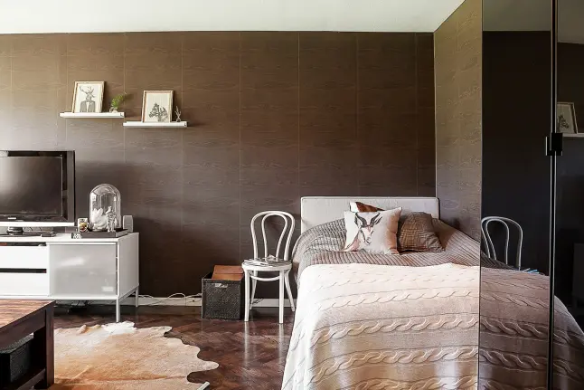 Zona de living se intrepatrunde cu cea de dormitor, reamintindu-ne ca vorbim despre apartamentul unui barbat unde accentul pica pe functionalitatea spatiului. Ceea ce frapeaza este paleta cromatica ce imprima amenajarii un aer sobru dar casual in acelasi timp, lipsit de orice fason.