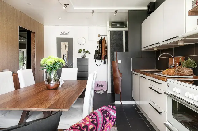 Peretele bucatariei este acoperit cu faianta mata neagra asortandu-se cu gresia din aceeasi structura si culoare. Spatiul este completat de mobilier alb si blat de lemn. O piesa interesanta este sortul din piele maro, un veritabil accent masculin pentru un bucatar desavarsit.