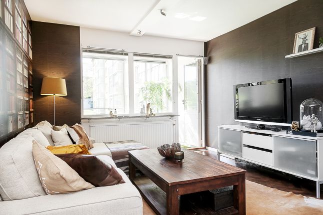 Pardoseala de culoare tip mahon si masuta de cafea cu un aspect usor nefinisat se combina foarte bine cromatic cu detaliile din piele: perne decorative si covorul.