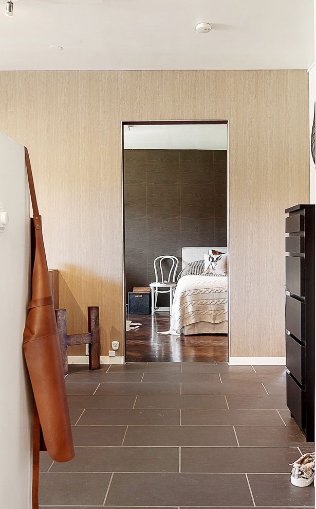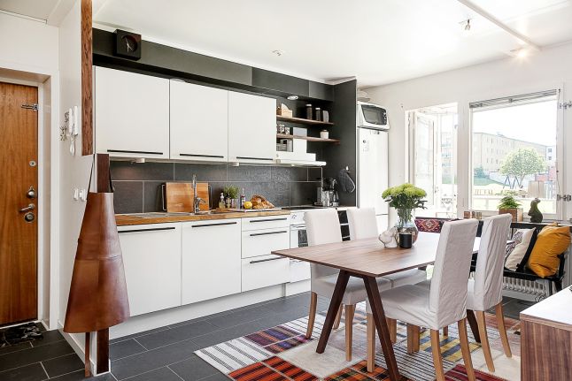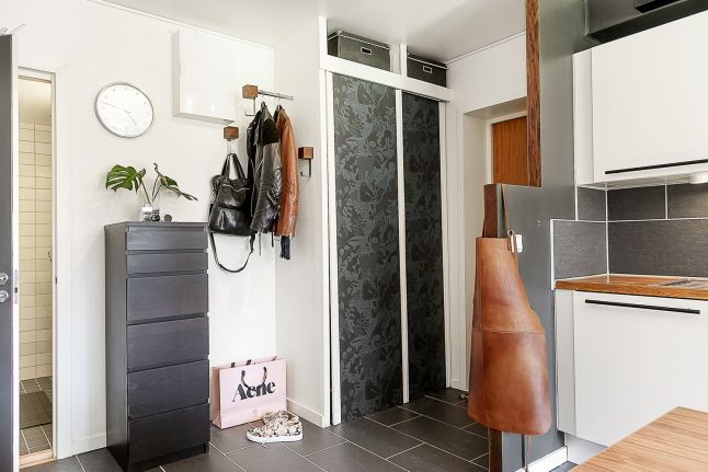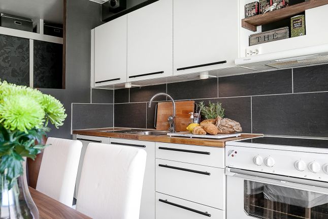 Peretele bucatariei este acoperit cu faianta mata neagra asortandu-se cu gresia din aceeasi structura si culoare. Spatiul este completat de mobilier alb si blat de lemn. O piesa interesanta este sortul din piele maro, un veritabil accent masculin pentru un bucatar desavarsit.