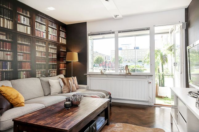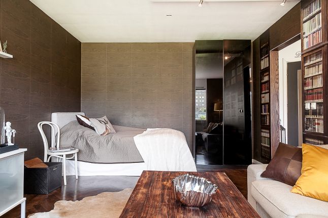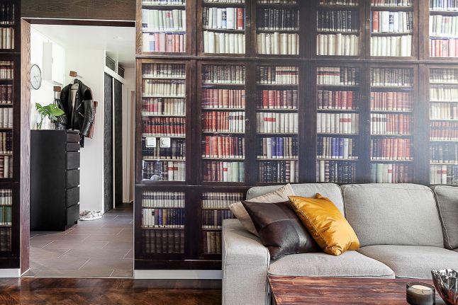 Din categoria ineditului face parte fototapetul care acopera intregul perete cu canapeaua, ilustrand o biblioteca imensa cu multe carti. Acuratetea imaginii pacaleste ochiul si creeaza un efect deosebit per ansamblu. Spatiul se continua ulterior cu un dulap si coltul dedicat dormitorului: un pat si scaun (albul ilumineaza aceasta zona, reflectand lumina naturala).